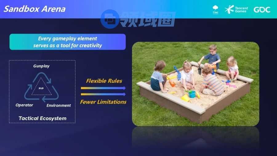 最后,我还想分享一个我们正在探索的设计理念—它叫做沙盒竞技场。我们总是能在各种视频网站上看到玩家令人震惊的创造力,比如发掘各种机制或是bug来创造他们的战斗优势。我们真的很佩服玩家的创造力,他们让这个游戏有了生命力,同时也为我们的游戏设计打开了新的视角。
