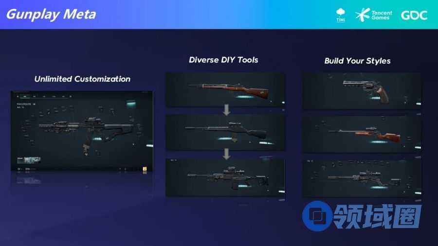 首先我想介绍我们的枪匠系统,与其他游戏不同,我们希望玩家能真正意义的定制自己的武器。我们移出了装备槽位的限制,提供了大量的风格各异的配件,你可以看到,每一把枪都可以改造成各种各样的风格——经典的、现代的、或是远超它原本设计的。并且,这并不只是改变了武器的外观,而是真真切切的影响玩家的武器玩法。