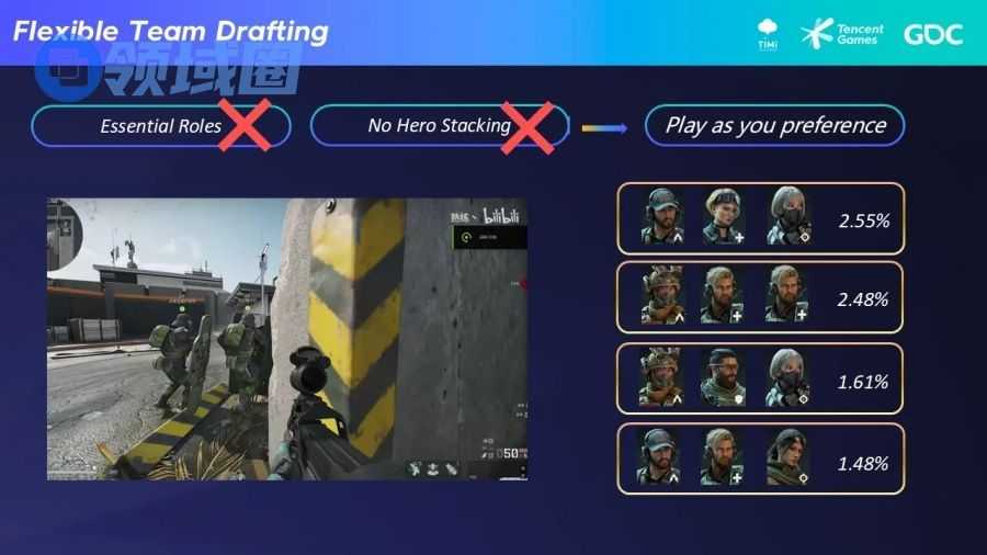 为了发展更多的打法套路,我们让配队的规则更加自由。在三角洲中,我们没有传统英雄射击的选人限制,你和你队友可以完全按照你们的理解进行配队,比如你们完全可以选三个同样的英雄。这种灵活性让玩家创造了非常多有趣的战斗策略,比如这个视频所呈现的那样。