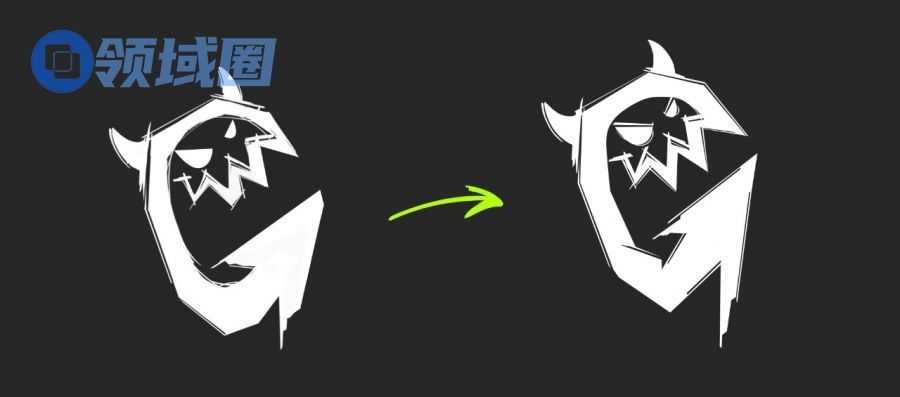 我们还把小恶魔的角和图形边缘修饰得更工整,让小恶魔的嘴巴和箭头的造型更接近,避免中间的负形过大。另外对“G”最后一笔的箭头设计拉的更长更有力道,让整体的造型更像"G"一些:
