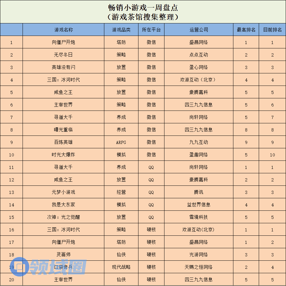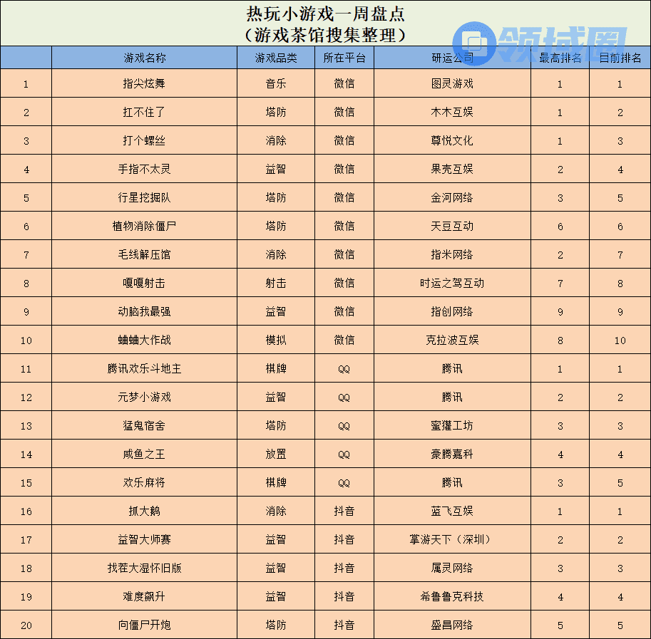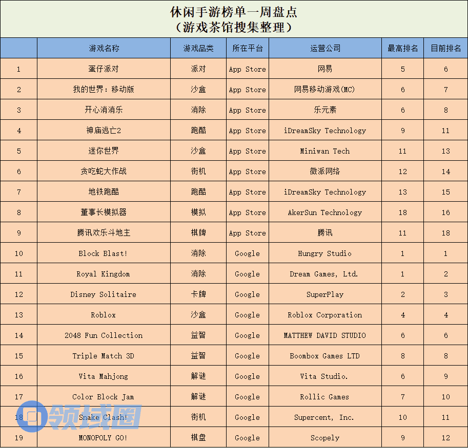 休闲新游周报每周统计微信小游戏、QQ小游戏、抖音小游戏、硬核小游戏以及App Store和Google Play上的新游爆款,并按照分类制作表格,将游戏排名情况等信息进行整理,希望给到行业同侪帮助。