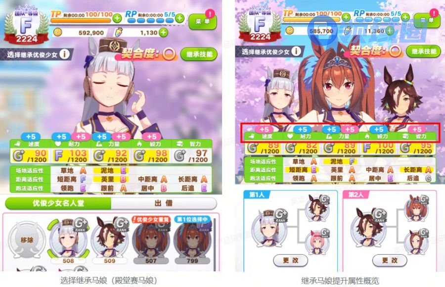 选择继承马娘:继承马娘来源于之前通过育成养成完成的殿堂赛马娘。继承马娘会在育成初始与育成过程中多次将其部分属性与部分技能随机继承给本次育成的马娘,增强其属性并赋予新技能。