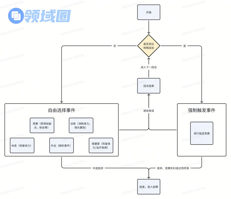 育成的大致流程如下图所示,玩家在局内会经过多个回合的事件,并最终到达终局或中途结束: