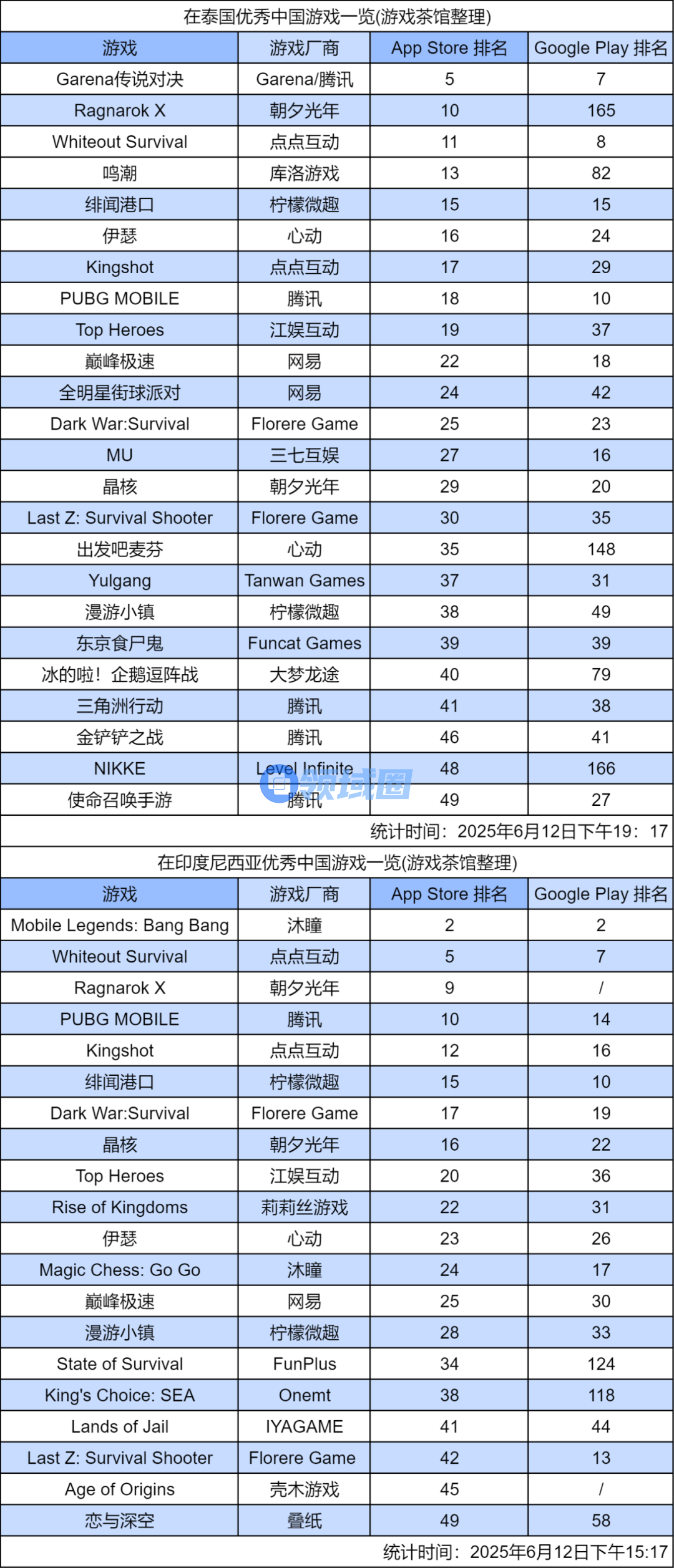 本期榜单中,在泰国及印度尼西亚最靠前的国产游戏分别为《Garena传说对决》和《Mobile Legends: Bang Bang》(以下简称《MLBB》)。