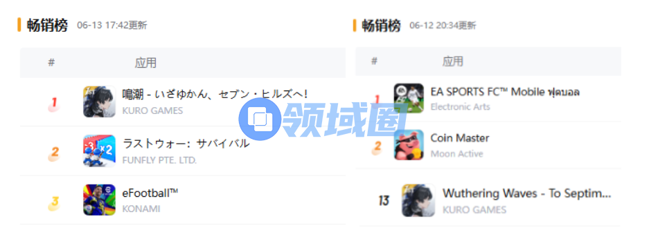 此外,得益于2.4版本“轻掷欢呼之冕”内容更新,近日库洛游戏《鸣潮》也在海内外强势冲榜。在全新5星角色卡提希娅、露帕以及全新区域七丘的加持下,今日,《鸣潮》不仅获得开服以来最好的游戏畅销榜成绩——国服第2、日服第1,在泰国也来到畅销榜第13。