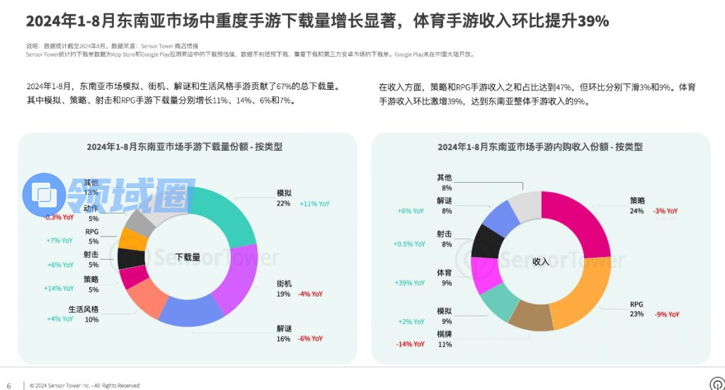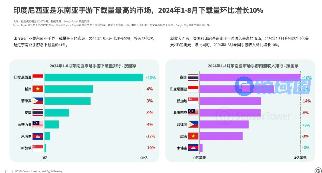 而据Sensor Tower发布的最新报告《2024年东南亚手游市场洞察》,2024年上半年,东南亚市场手游下载量环比提升3.4%至42亿次,其中,印度尼西亚是东南亚手游下载量最高的国家,贡献了41%的总下载量,而泰国和印度尼西亚则是东南亚手游内购收入最高的地区。
