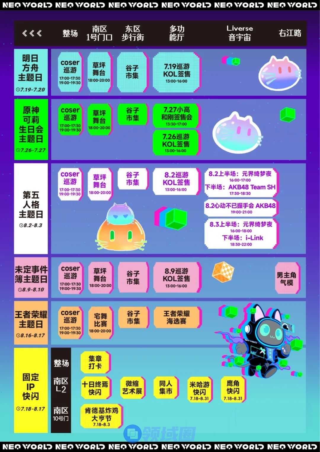 除此之外,元界发布会上还公布了将在7 月 18 日至 8 月 17 日举办“元界夏日嘉年华” 。在为期五周的活动中,《明日方舟》《原神》《第五人格》《未定事件簿》《王者荣耀》等头部 IP 将轮番打造主题周,每周都有 Coser 巡游、主题草坪演出、“谷物之町” 谷子市集、人气 KOL 签售会等活动,不仅让二次元们沉浸其中,也为城市带来了新的活力,常有众多为此驻足拍照的人。