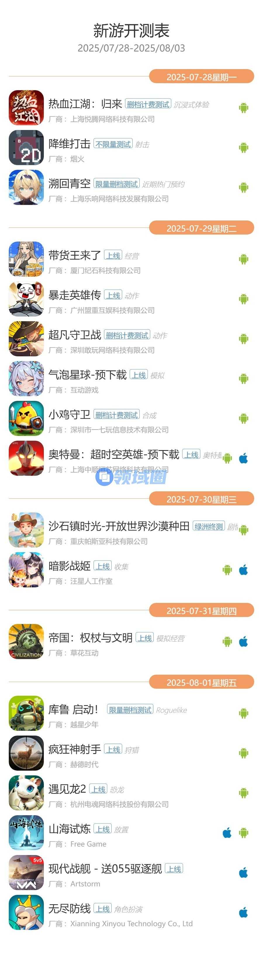 2025年7月28日—2025年8月3日的最新手游开测信息,共有18款游戏开测。以下是开测信息:
