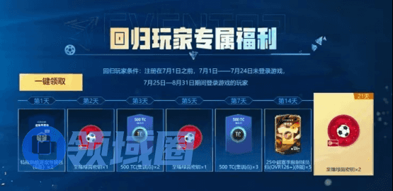 为了回馈广大玩家,《FC ONLINE》球王节除了有全新的玩法,还带来了海量福利,与所有球迷共享盛宴。在7月25日已上线的“球王节6周登录福利”中,玩家可领取海量游戏道具与球员包;7月27日当天登录游戏,便能直接领取“25中超赛季韦世豪球员卡”;在7月25日-8月31日期间,玩家只需每周登录游戏更能获得一次限定签名球衣的抽取机会,到底谁能“欧气爆棚”赢得亚亚·图雷、阿德里亚诺、托尼·亚当斯一众名宿的亲签球衣,值得期待!