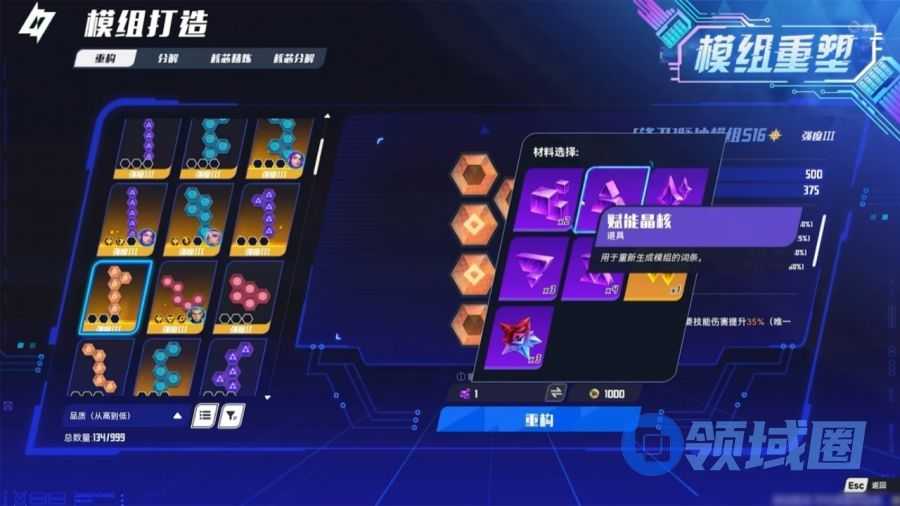 - 模组,局外BD部分,不同模组有不同的形状(形状可进行重构,重构也意味着这方面的养成会比较深),嵌入合适的模组获得最大化加成,更换时需要进行空间管理思考,并且可以镶嵌核芯获得额外属性效果,通过关卡概率获得。