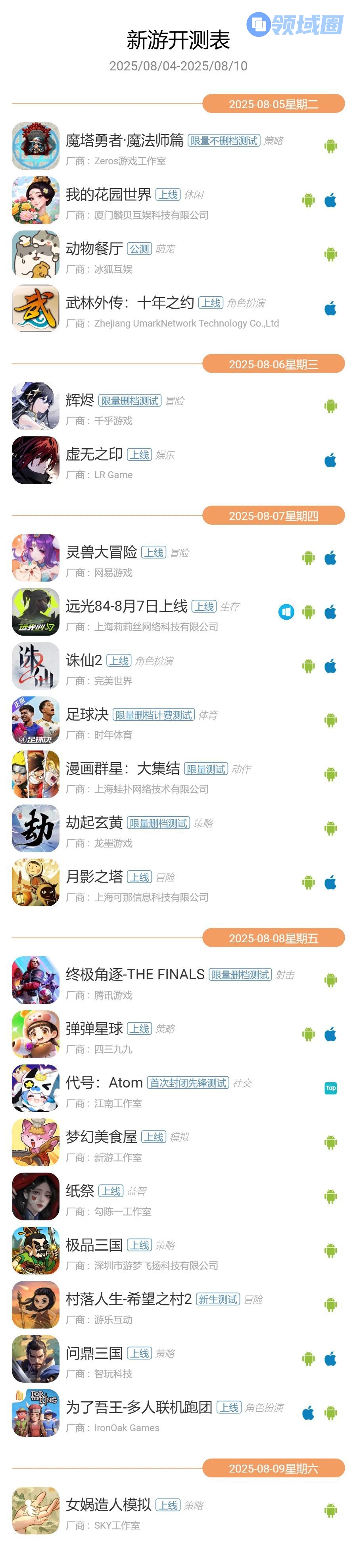 GameRes游资网统计了2025年8月4日—2025年8月10日的最新手游开测信息,共有23款游戏开测。以下是开测信息: