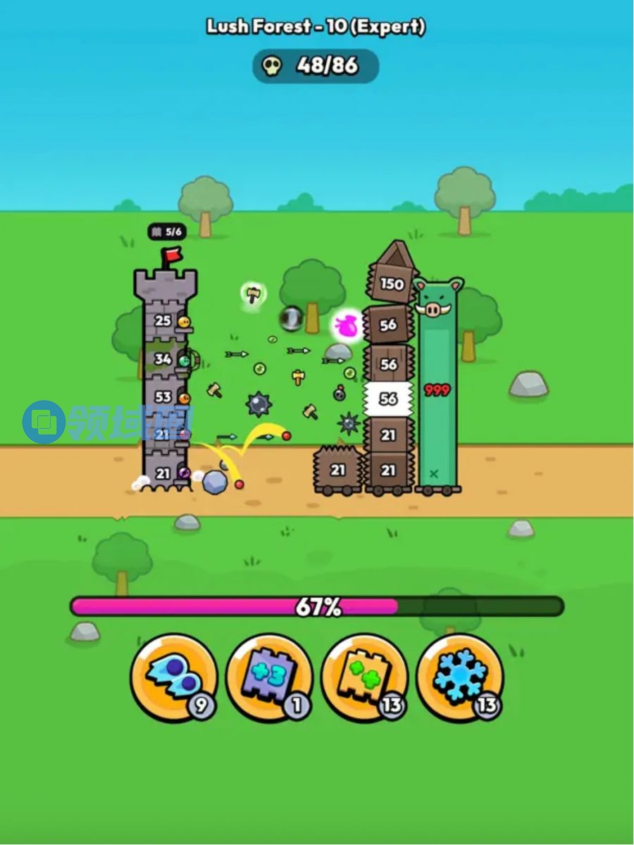 介绍:又是来自猫厂TREEPLLA的新游。玩家堆砌一个左侧的城堡,每一层代表一种兵种,不同兵种能力不同,比如反弹、弓箭手、斧手、投石手等等。每击败一波敌人可以3选1选择各种buff或者增加兵种。