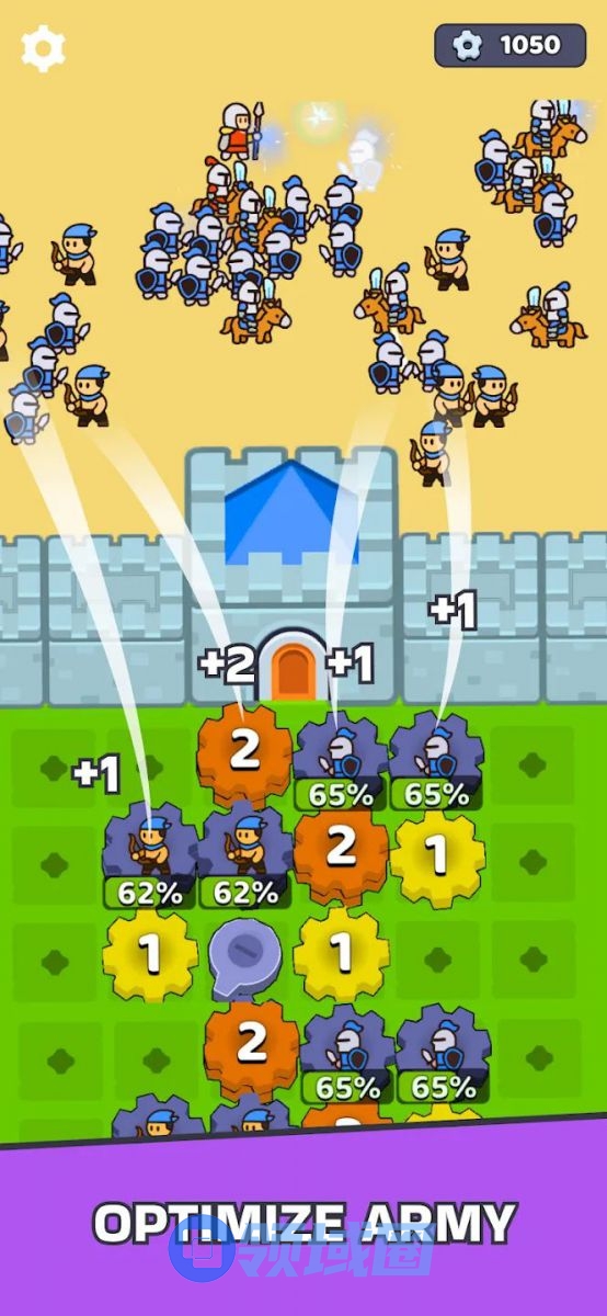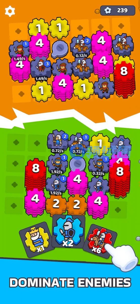介绍:依旧还是齿轮玩法,用造兵齿轮和各种传动齿轮组成齿轮传动的结构,造兵和对手对推,各种齿轮可以二合merge升级来提高生产效率和等级。稍微有些创新的是这次做成了上下PVP的形式。