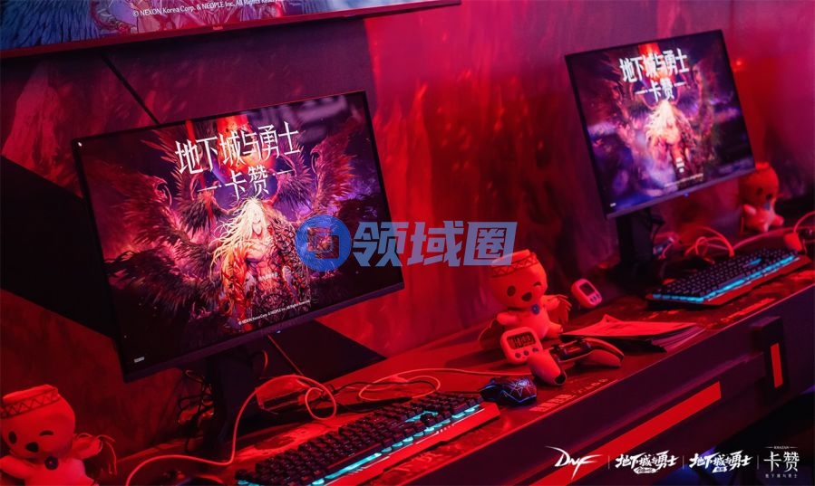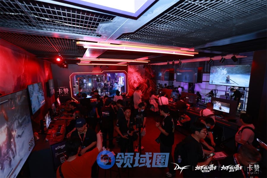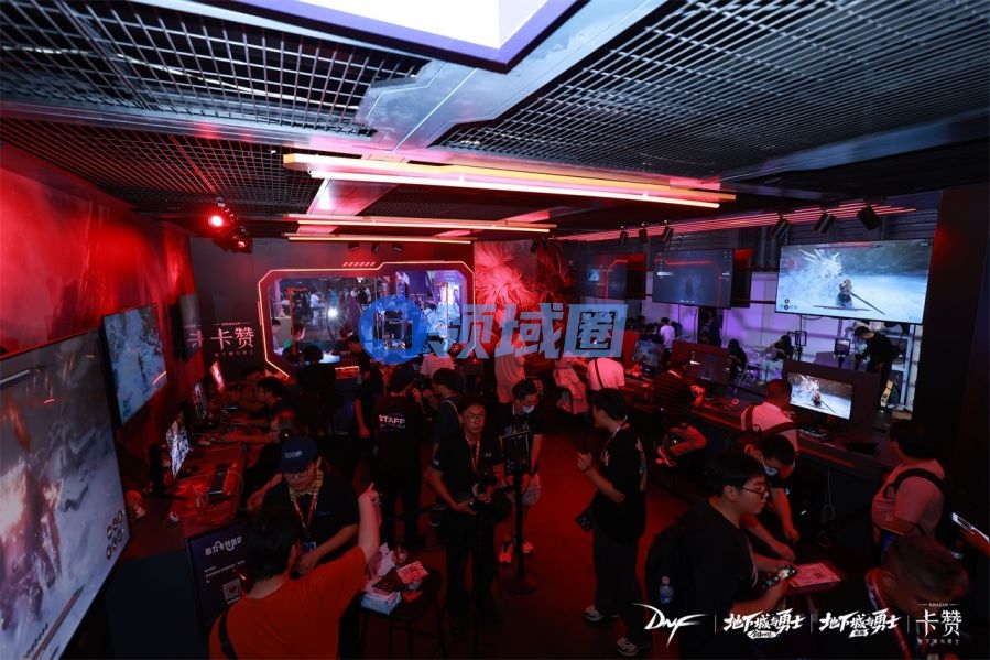 试玩区内,随处可见的《地下城与勇士:卡赞》海报,在DNF标志性的暗红色氛围灯光映衬下,营造出十足的沉浸感。而在试玩区外的一侧,则是排起长龙的玩家。