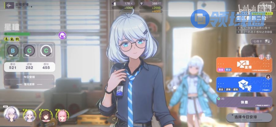 日常环节的经营管理上,玩家需编排每位角色的行程,开直播积攒粉丝数量与积分,安排训练提升意志、逻辑、感知等属性,每次行动会增加不同程度的压力,休息可减轻压力。