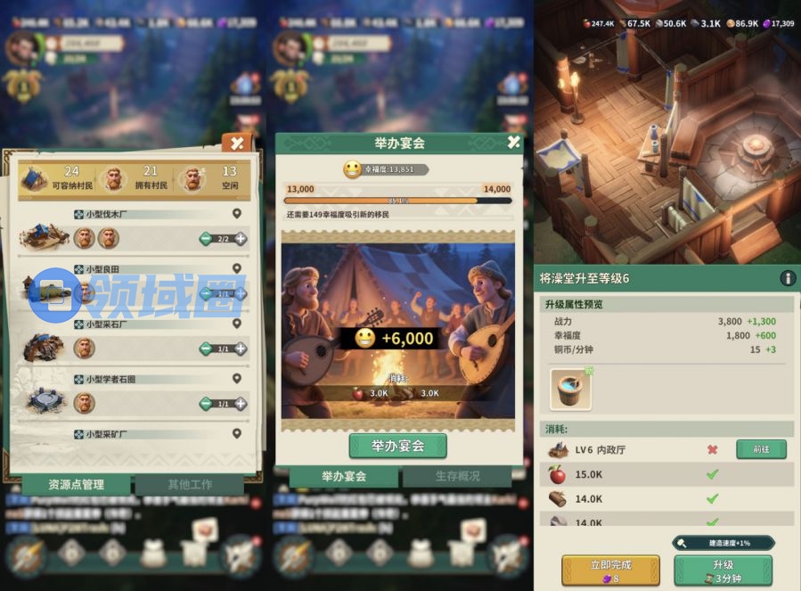《Fate War》作采用当下较为流行的“SLG+模拟经营”组合,在城建玩法里引入居民和幸福度概念。派遣居民入驻资源型建筑可以提升产能,提升幸福度可以增加居民人口。幸福度的提升主要依靠修建和升级生活类建筑,比如民居、公共澡堂等实现。