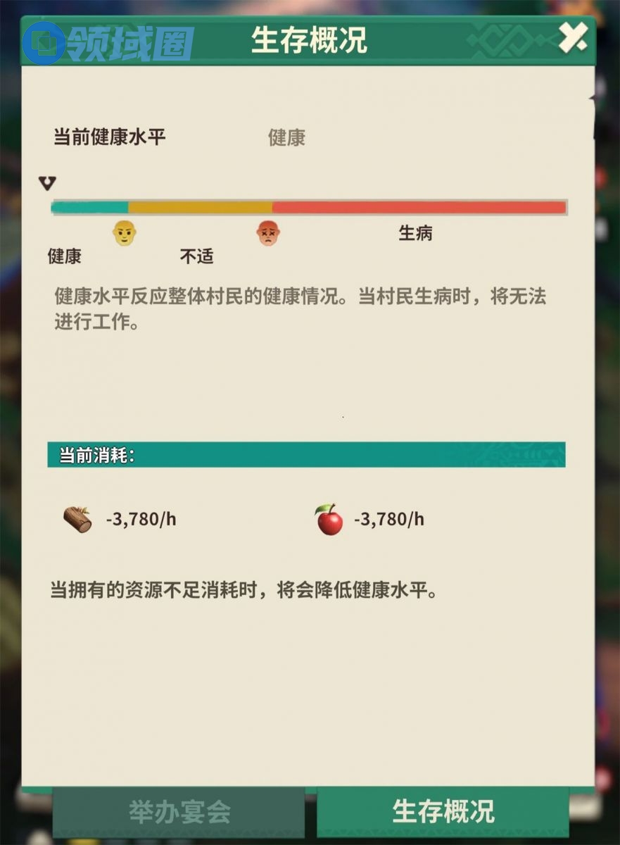 除了幸福度,游戏并没有模拟经营常见的各种生存属性值,不过居民每小时都要消耗一定的食物和木材,如果这些资源不足,就会影响到居民的健康值。一般来说,玩家只要正常发展,完全能够满足这些消耗。《Fate War》显然想在数值方面简化模拟经营玩法的负担,仅为玩家保留那种经营的氛围感。