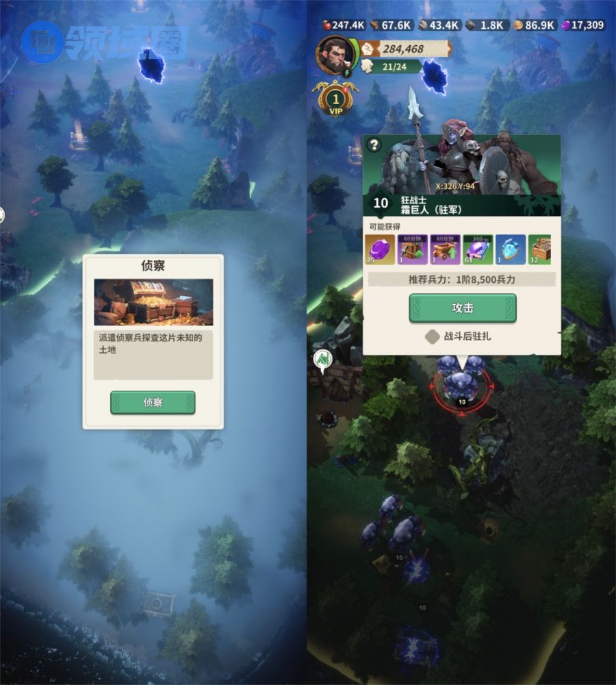 比起模拟经营,游戏前期其实更强调营地探索。玩家需要跟随任务引导,驱散围绕在营地四周的迷雾,再通过战斗扩张领地。在这个过程中,与战斗和角色养成相关的内容会逐步释放,后期解锁大地图玩法后,玩家便能较为顺滑地过渡到与 SLG 有关的玩法。