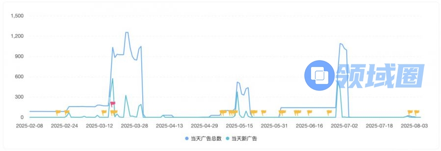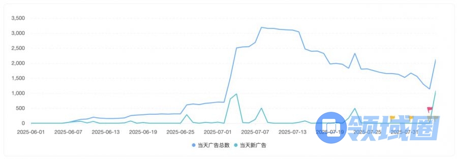 据 AppGrowing 国际版 数据,《Fate War》自 6 月初开启投放后,广告量便持续稳定增长,日投放量到月底已经突破 500 组;进入 7 月,买量更是爆发式增长,日投放量直接突破 2500 组,最高可达 3000 组以上,后面有所回落也依旧维持在较高的投放量级。