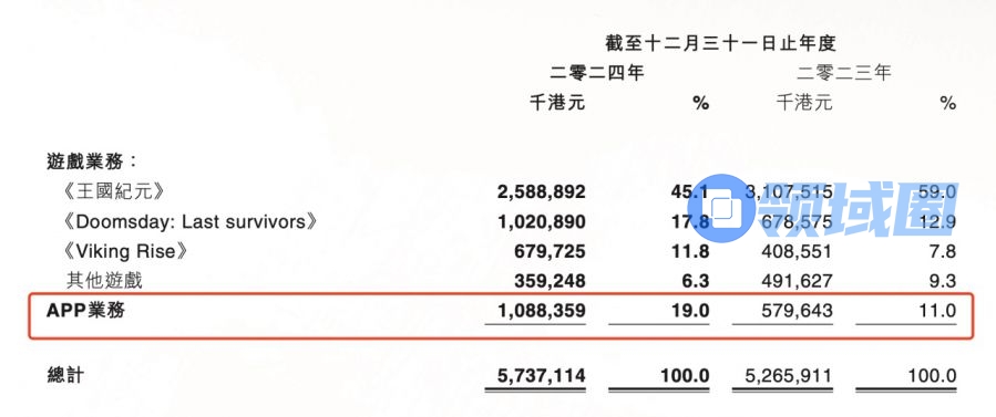 带动去年实现增长的“头号功臣”,其实是非游 App 业务。据财报显示,去年 App 业务营收同比增长近 88%,约为 11 亿港元。作为对比,游戏业务在 2024 年的营收约为 46.5 亿港元,甚至低于 2023 年的 46.9 亿港元,不增反降。