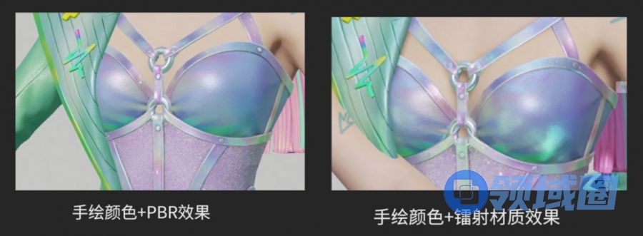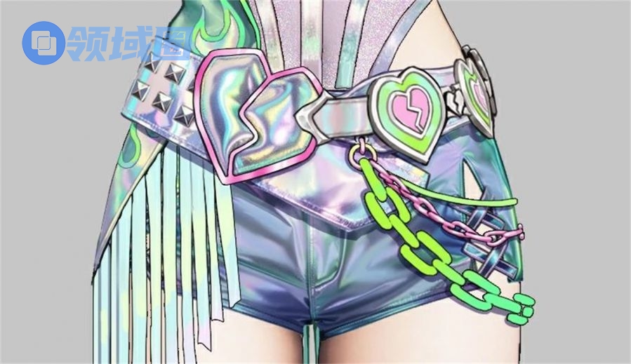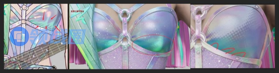 举例来说,在这套时装里我们使用了大量的镭射材质,而为了实现这个效果我们在建模阶段下了很大的功夫。比如琉璃的上装边缘处,我们就特地通过手绘镭射颜色的方式去加强模型里的镭射效果,更可控地去还原原画: