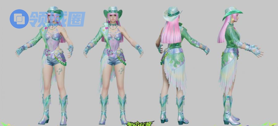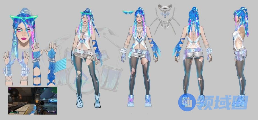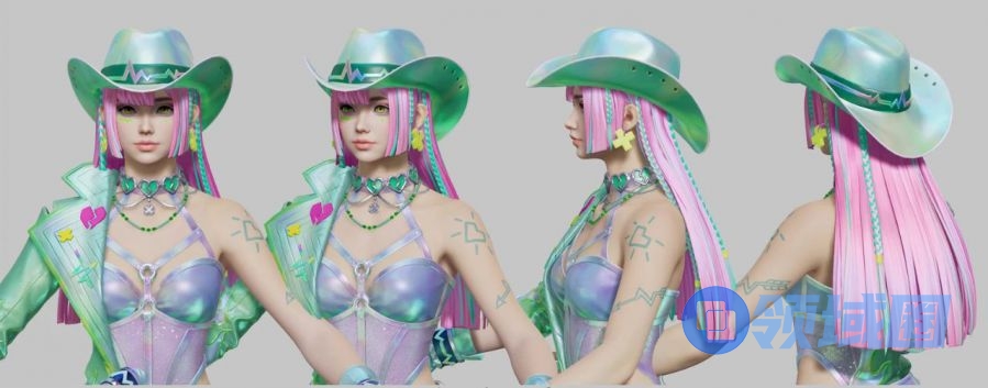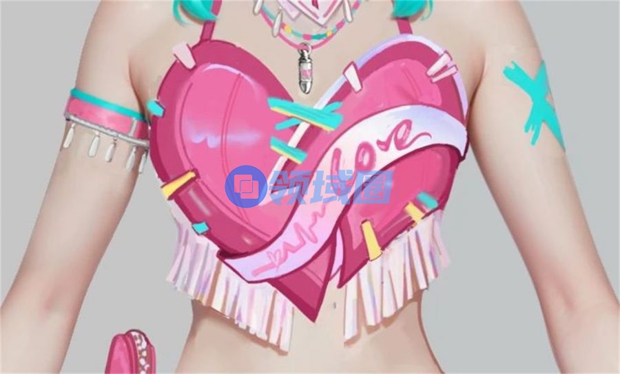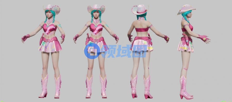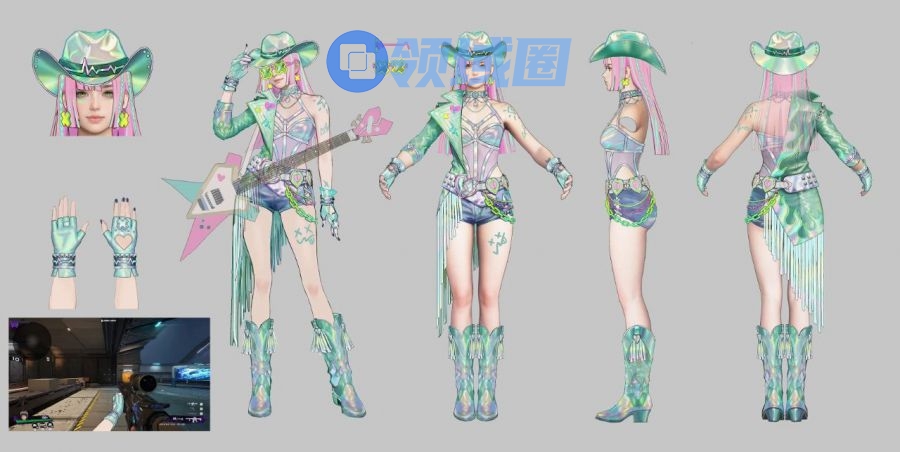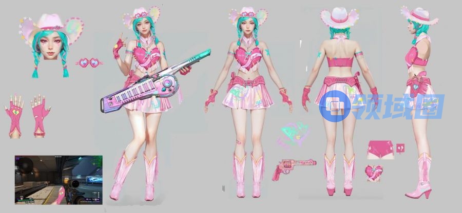 至于键盘手妮巧的时装,则是标准的美式甜心牛仔服:心形吊带、牛仔短裙、腰间的左轮手枪,还有粉色的色调都是其标志。我们还创新性地在她吊带的正面设计了一条能显示跑马灯特效的电子屏幕,让她的这套时装更具特点。