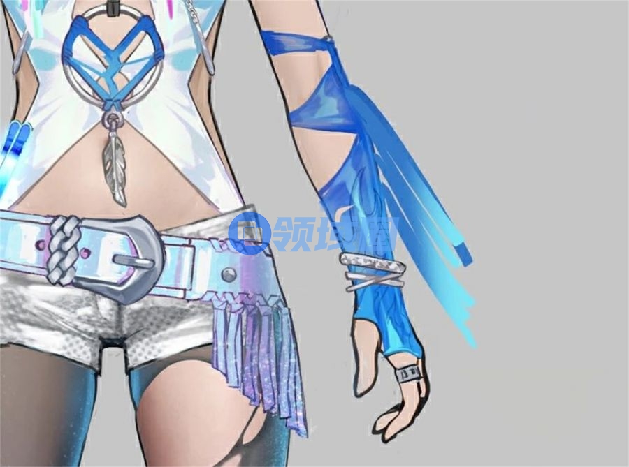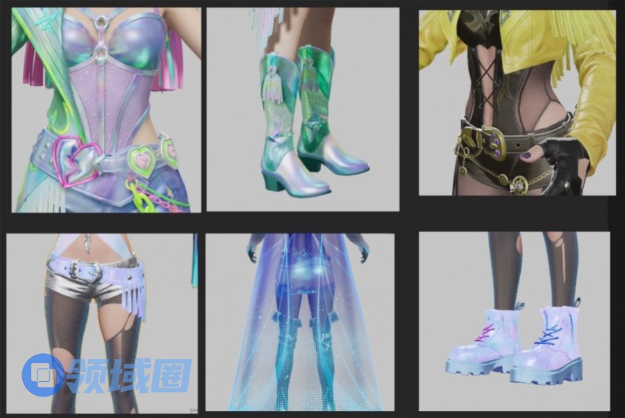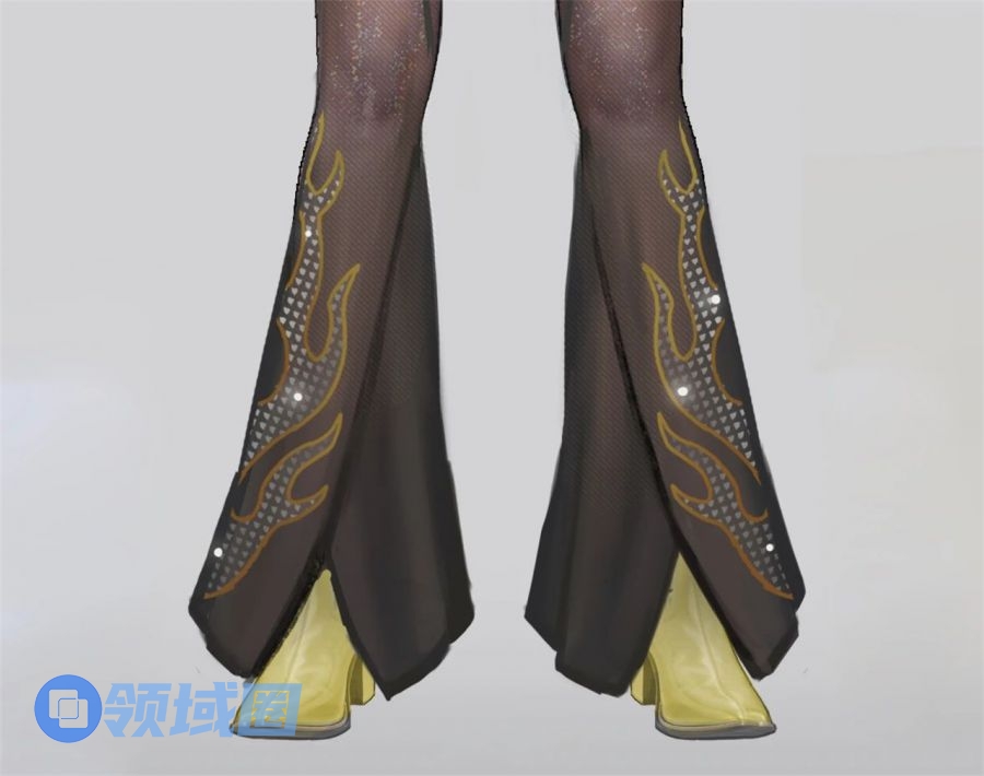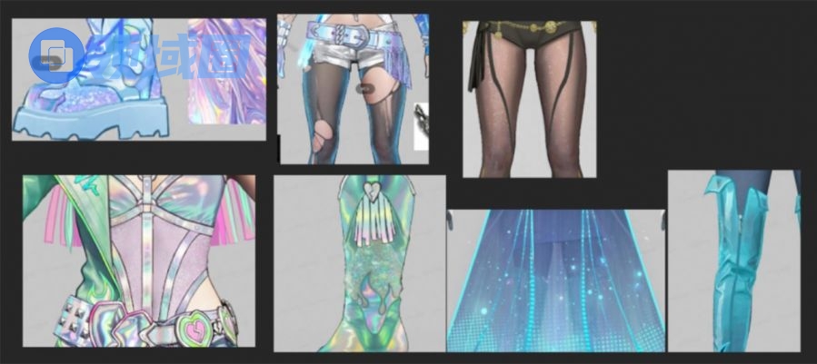 仔细观察原画你还会发现,除了镭射材质之外,其实在很多地方还藏着亮片和闪点的元素。如果不把这些细节还原出来,原本亮眼的演出服会瞬间变得黯然失色。为了能更好地呈现这样的点睛之笔,我们决定新开发一种材质,叫做动态闪点。