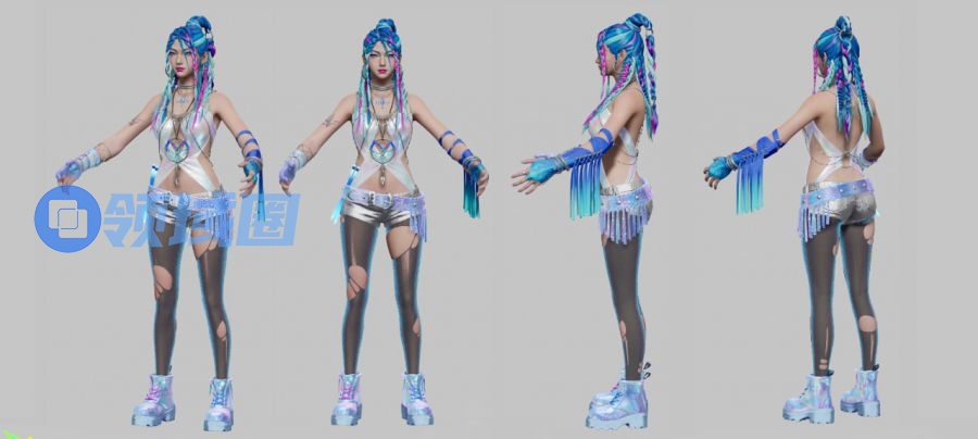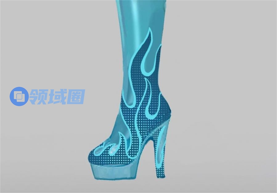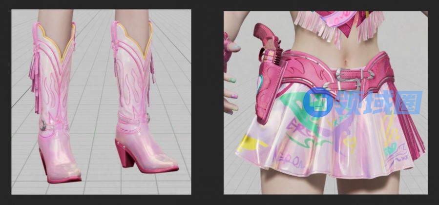 妮巧的靴子和裙子的材质也是一样,使用手绘+镭射材质球,能更大程度的体现出未来感: