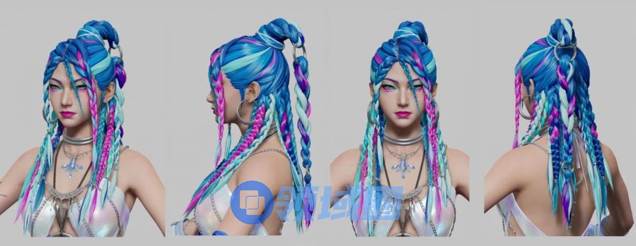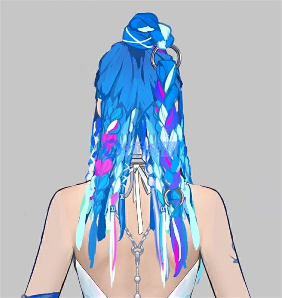 就拿天命来说,她的设定就是洒脱的、疯狂的,所以我们给了她鼓手的身份,并且把视觉重点放在了她的头发和妆容上。亮眼的编发造型加上多彩的发色和浓重的妆容,一个玩世不恭的鼓手形象立马呼之欲出: