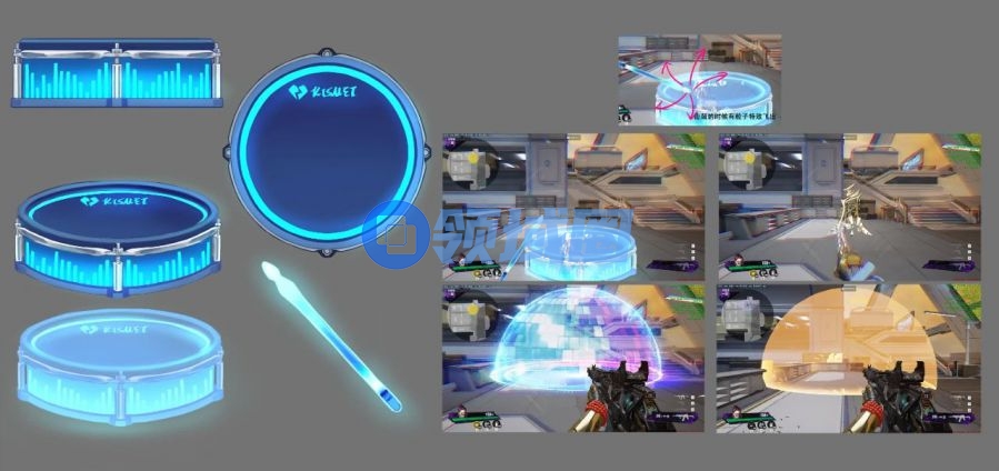 在确定了角色的时装概念之后,我们也根据这些时装的特点,设计出了她们的衍生技能皮肤。比如天命的技能特效,就被融入了鼓面、鼓槌、迪斯科灯球等元素: