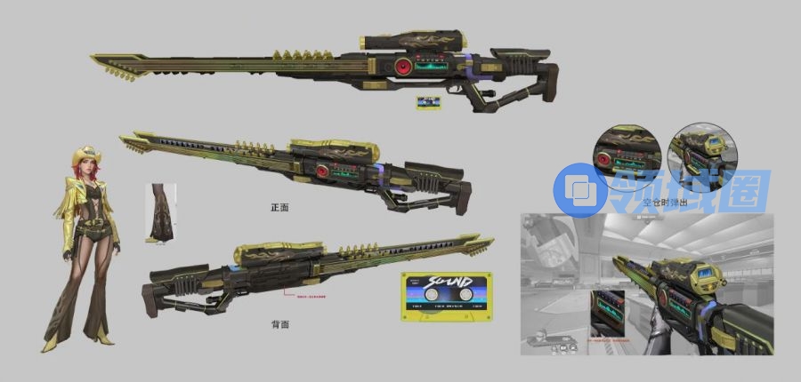 流星的狙击枪不仅枪管变成了吉他的造型,枪身上还被设计进去了一台磁带随身听,除了有播放按钮和音频频谱之外还有扬声器的喇叭,甚至连换弹都变成了换磁带,这些细节无不彰显着我们的巧思: