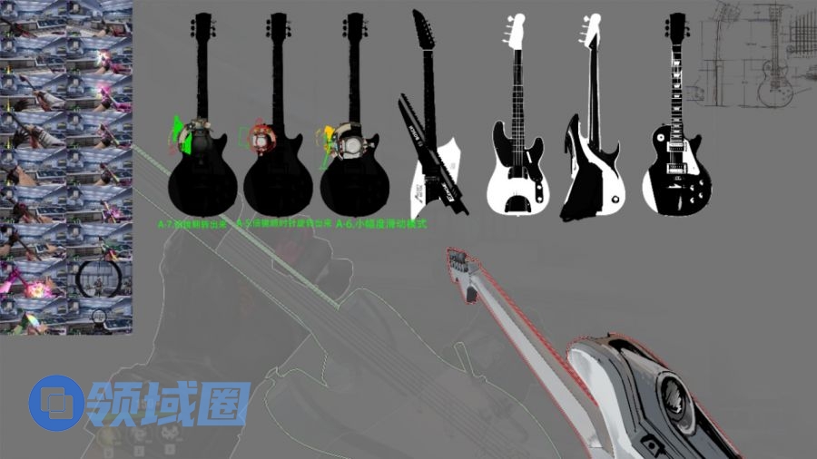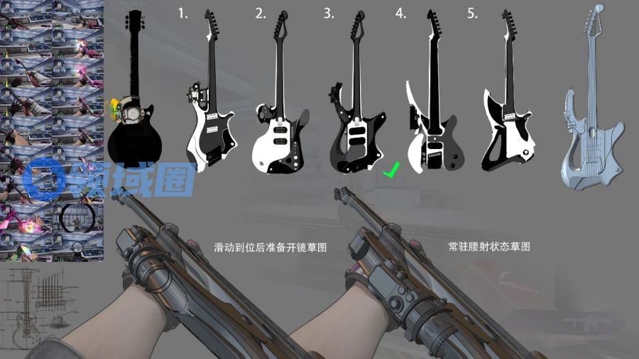 通过快速草图迭代,优先确认吉他在玩家视角下的核心剪影。这一步要确保武器在视觉上能明确传达“吉他”的乐器身份。