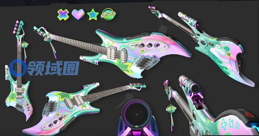 武器皮肤的设计和角色皮肤的设计是并行的。在确定了以音乐节为主题后,我们深入地分析了目前的竞品,然后发现当前主流FPS游戏在武器设计上普遍遵循一个基础原则:保留枪械的核心识别特征与操作点位,在追求造型夸张化与保障战场快速辨识度之间寻求平衡。