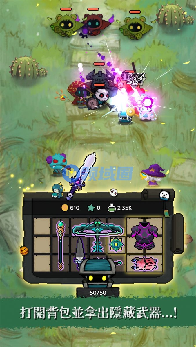 在传统的放置冒险RPG框架上,《庞宝: 背包英雄们》加入的开箱+背包机制是其最大的玩法亮点。玩家在每次击败敌人或特定事件可获得宝箱钥匙,每次开启宝箱可获得3件随机装备。