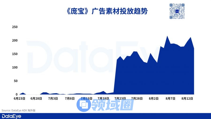 DataEye-ADX海外版数据显示,《庞宝: 背包英雄们》早于6月底开始投放广告,在整个预约期都保持着少量的投放。在上线Google Play后,游戏加大了投放力度,单日投放素材量超过150组;随着App Store的上线游戏的单日投放量能突破200组。