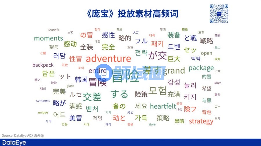 在投放高频词Top 100中,无论是哪种语言,「冒险」都是游戏投放围绕着的最重要关键词。也可以看出对外传递出冒险的游戏感对于《庞宝: 背包英雄们》来说比起围绕着「策略」「放置」做宣传要点更重要。