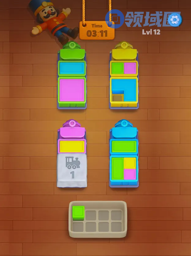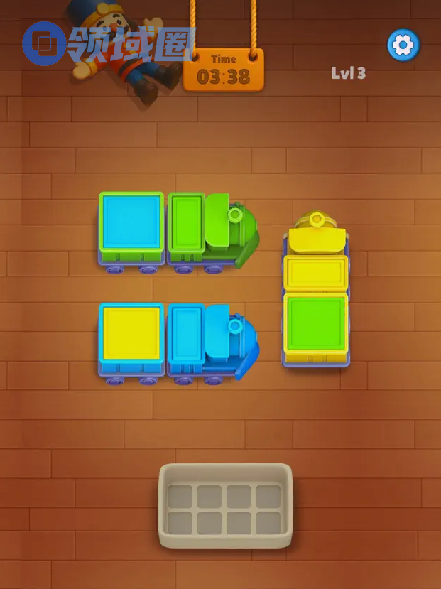 介绍:超出预期,玩法是积木块sort,把对应颜色和形状的积木放在对应颜色的火车中,或者互相之间有遮挡关系,并按照遮挡依次开出关卡,玩家要做的就是利用下方的空盒子,腾出空闲空间来回摆放各色积木,把所有积木还原。