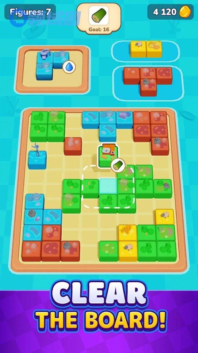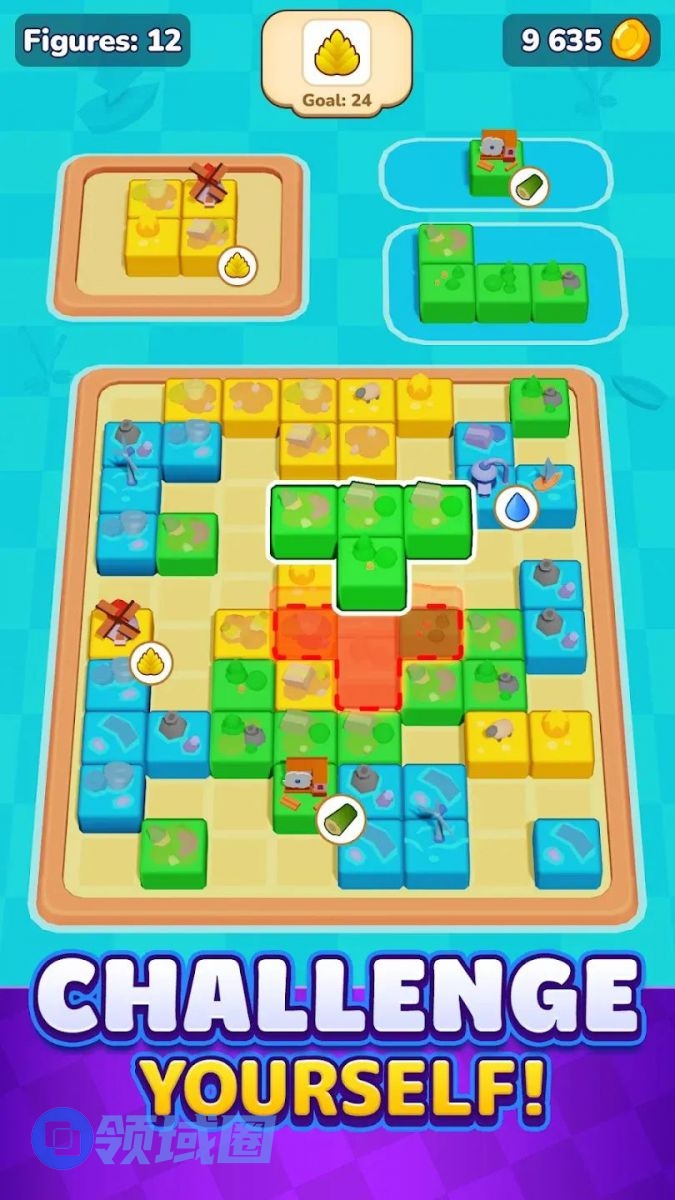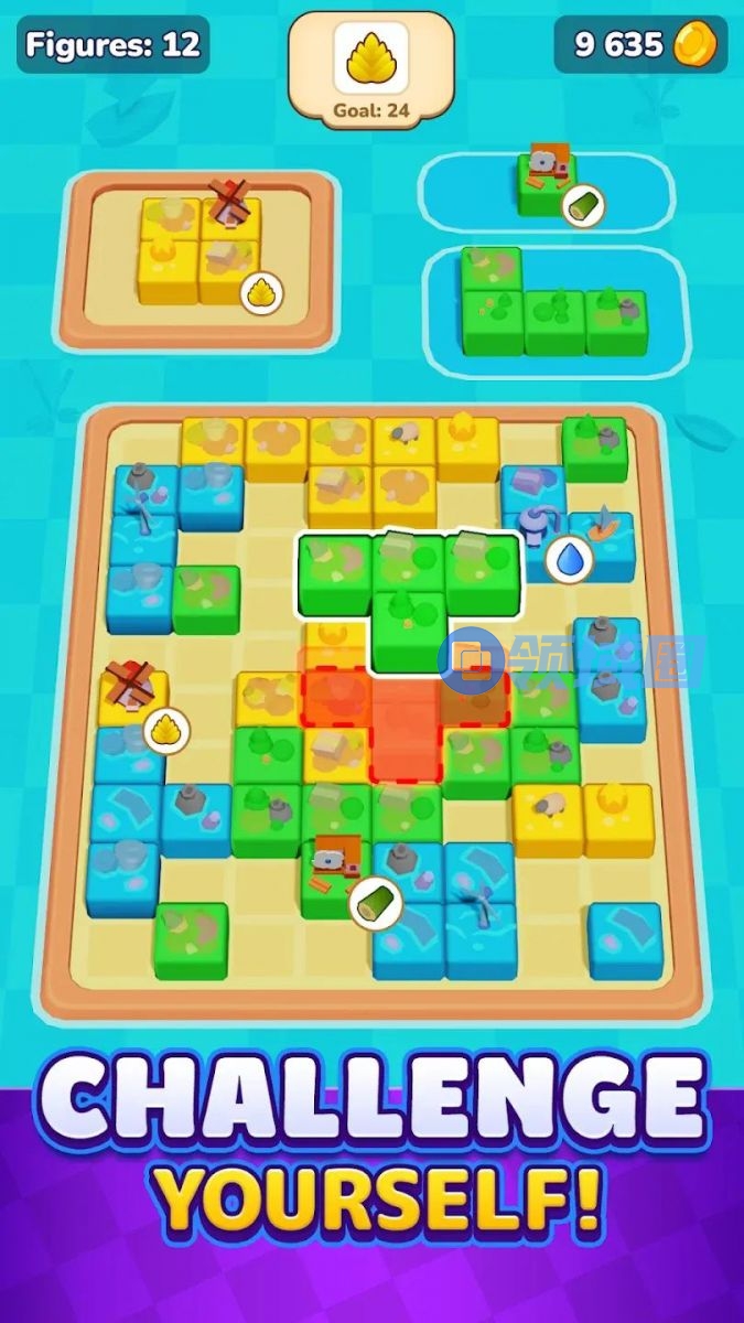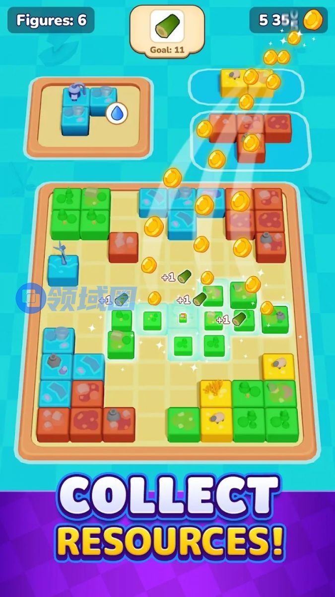 介绍:不同颜色的俄罗斯方块,代表不同类型的资源,比如木材、水、枯草等等,玩家需要先按照俄罗斯方块的规则摆放他们,然后再摆放对应资源的采集器,采集器放在对应资源的方块旁,才能对其进行收集。相当于额外增加了一个对应颜色资源和采集器的摆放玩法。