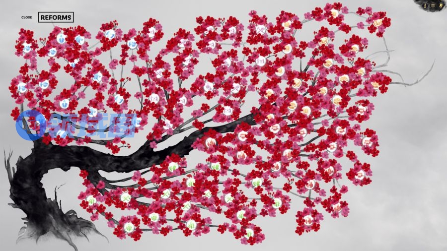 每次讲技能树貌似都绕不开的案例,一颗真正的树。技能树以水墨树枝的形式展开。每一个技能点都像枝干上的新芽,随着成长逐渐蔓延成一棵繁茂的树,营造出独特的东方美学氛围。