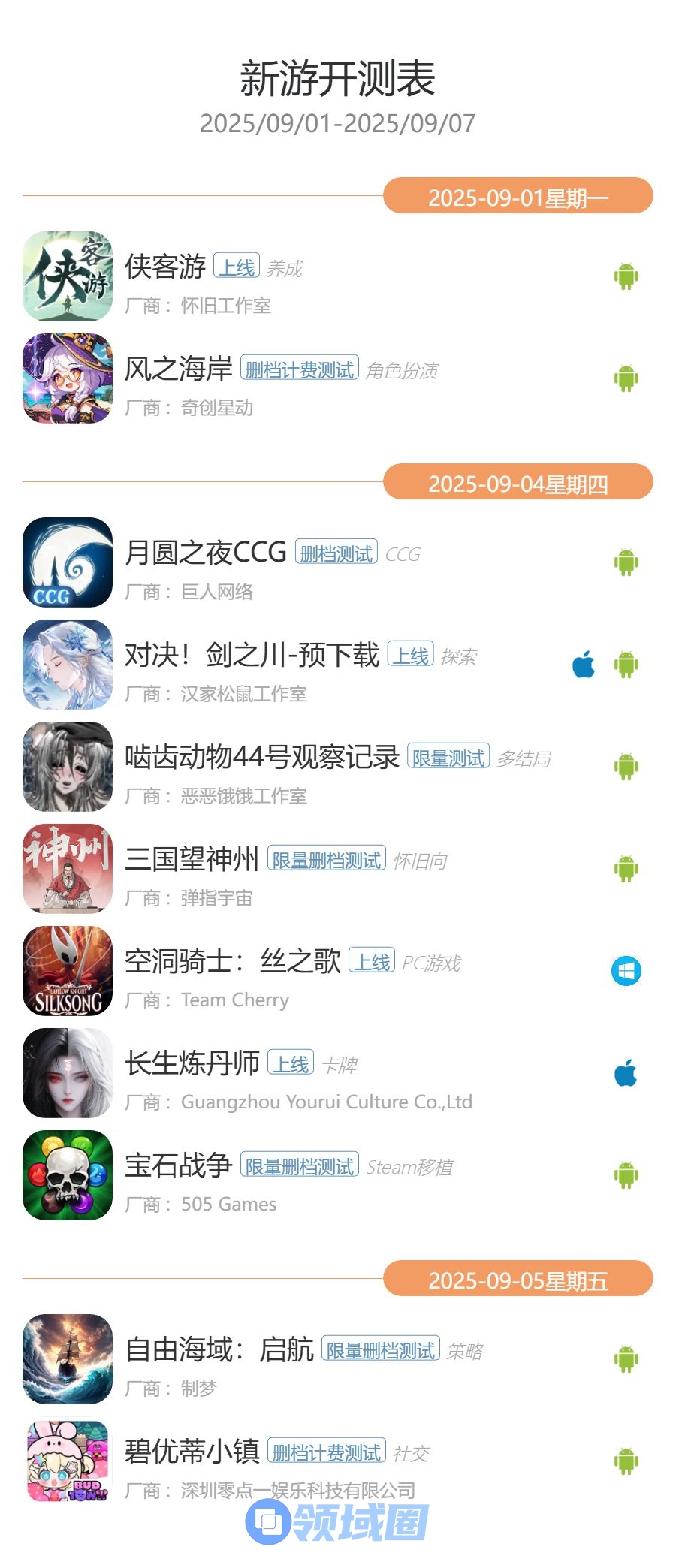 2025年9月1日—2025年9月7日的最新手游开测信息,共有11款游戏开测。以下是开测信息: