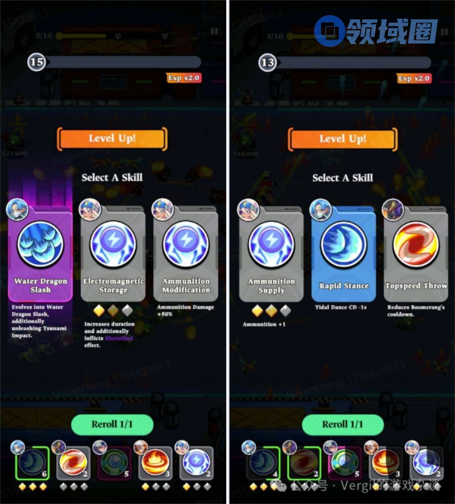 玩家拾取一定数量的经验会升级,并触发三选一BUFF: