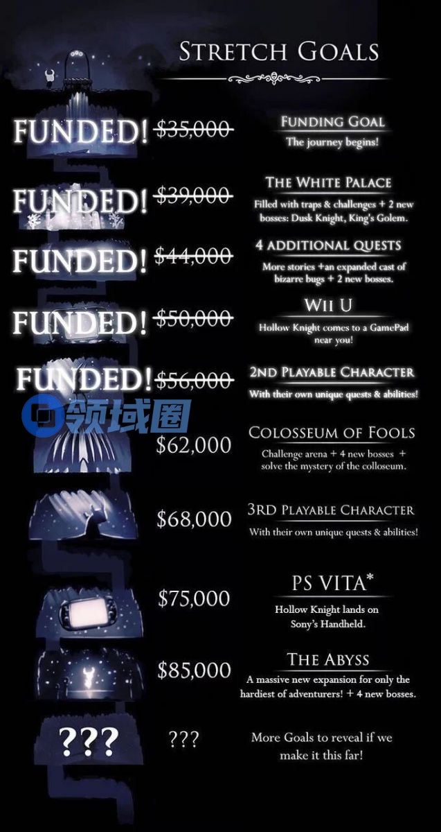 (Greenlight)的批准。两天后,这款游戏又被Kickstarter推荐至首页。12月10日,樱桃社公布了《空洞骑士》众筹的拓展目标。