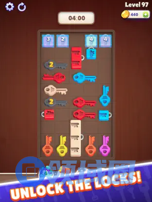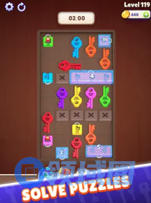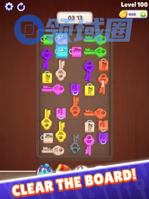 介绍:利用钥匙+锁的匹配玩法,对应颜色的钥匙对应一个颜色的锁,两者合并在一起即可消除。然后在此基础上拓展增加玩法,从表现上有钥匙、刷卡等各种外形题材的包装,从玩法上则比较像CBJ,有冰冻、限制单轴移动等各种规则和元素包装。