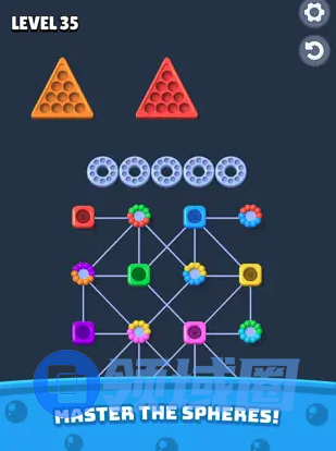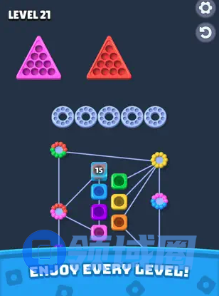 介绍:Rollic出品,而且游戏也一股“Rollic味儿”,不过gameplay组合形式更“抽象”了一点。游戏中有多个路线,玩家需要点击路线上的终点黑洞,来把与其相连的路线上的同色小球都进行收集,收集到上方类似“弹夹”的槽中,并最终进入最上方的三角架托盘中。在这个过程中。小球-黑洞、黑洞-弹夹、弹夹-三角架其实是3段ASMR的反馈,整体是解压的质感。