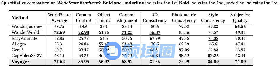 该模型在斯坦福大学李飞飞团队发布的世界模型基准测试WorldScore上位居综合能力首位,超越现有开源方法,在视频生成和3D重建任务中均表现出色。在视频生成和视频3D重建两个任务上,Voyager也均取得更好的结果。