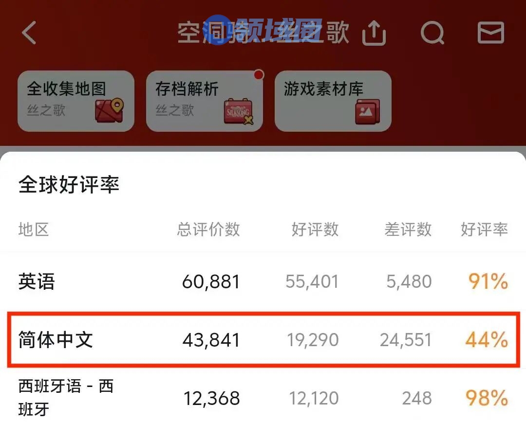 上线第一周,《空洞骑士:丝之歌》的简中区好评率跌破50%,是主流地区中评价最低的,比倒数第二的日语地区(68%)还要低20个百分点。