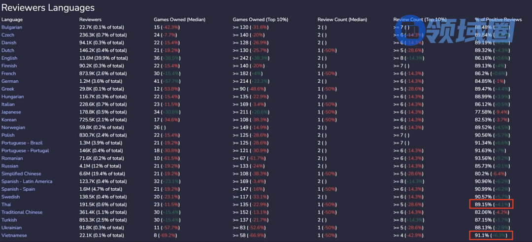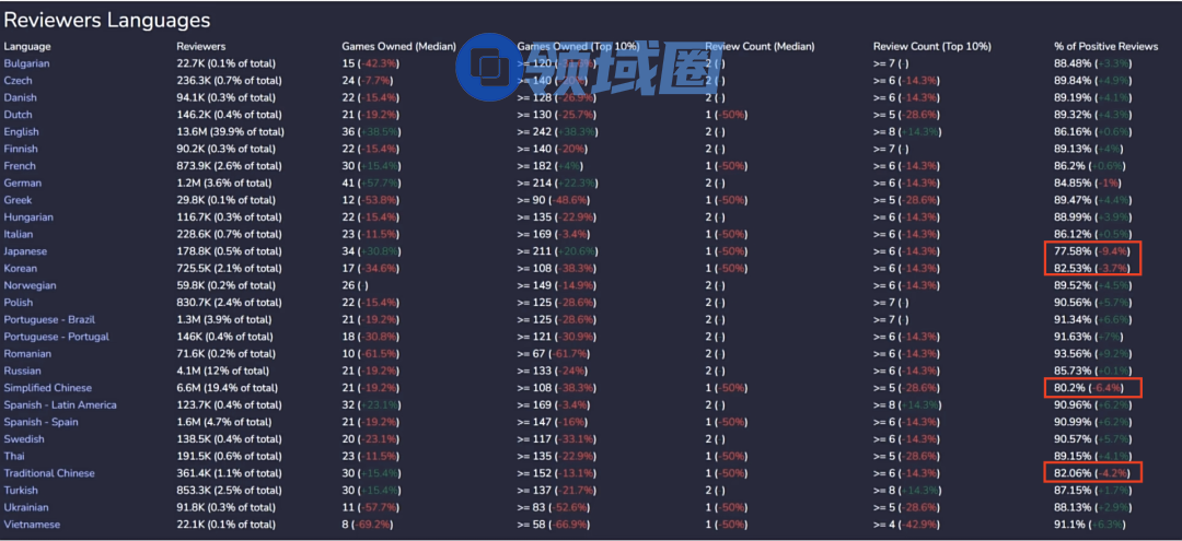 事实上看数据的话,好评率最低的是日语、简中、繁中、韩语,因此我觉得最主要的还是文化因素。与其他文化圈相比,泛儒家文化圈一直不太有鼓励式教育的传统,大家比较吝啬自己的赞美。在游戏评价上面的表现就是,只有特别好的游戏我才愿意去给好评,但是游戏只要稍微有点问题我就愿意去给差评。我觉得这才是好评率差异最大的因素。