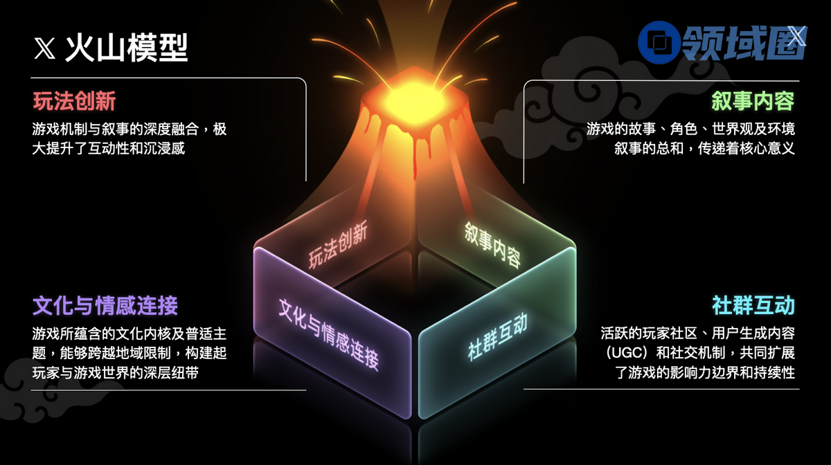 2024 年,X 平台上与游戏相关的贴文内容高达 70 亿条,通过 Grok AI 的加持,X 在《白皮书》中总结出“火山模型”,并提取出游戏取得成功的四大关键维度: