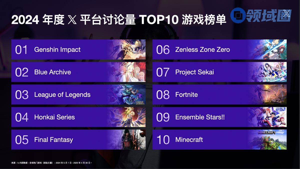 今年的《白皮书》中继续收录了“ X 平台 2024 年度全球游戏热议榜单”。《原神》连续四年位列榜首,紧随其后的是《蔚蓝档案》和《英雄联盟》。值得关注的是,榜单前十名中,中国游戏占据四席,除《原神》外,《崩坏》系列、《绝区零》以及《偶像梦幻祭》也强势上榜,展现出中国游戏在全球市场上的突出影响力。