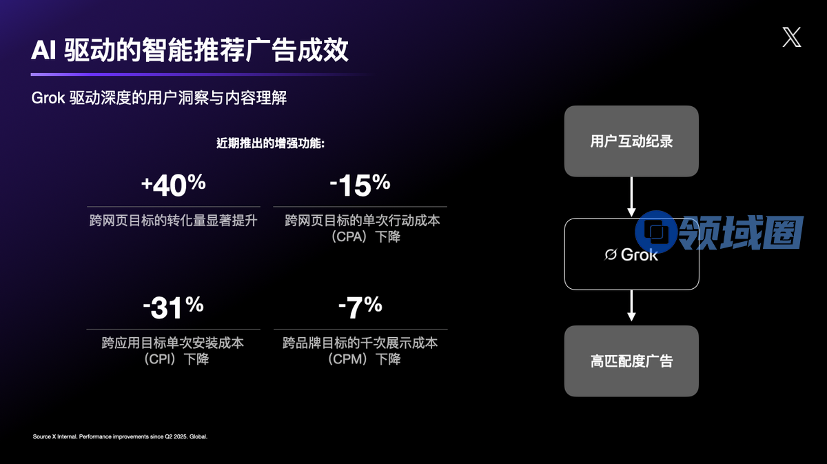 作为全球最大的实时对话平台,X 拥有超过 5 亿月活跃用户,在 140 多个国家成为领先的新闻与文化阵地。平台用户群体以高收入、高学历、高影响力著称,构成起中国品牌全球化的理想受众。过去一年,X 已推出 300 余项创新功能,用户活跃度显著提升 10%,正在快速转型为“万能应用”。面对势不可挡的 AI 潮流,X 平台正在不断提升技术水平,重塑广告生态。依托 Grok AI,X 能够在实时对话和用户行为中捕捉深层洞察,并在创意生成、广告投放和效果优化的全链条上实现 AI 驱动。最新的广告产品已经展现出显著成效: